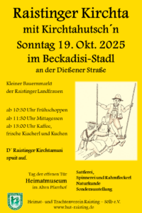 Anschließend ist das Raistinger Heimatmuseum des Vereins geöffnet. Neben den ständigen Ausstellungen im Museum, wie den Fundstücken aus der Kelten- und Römerzeit, dem Vogel des Jahres, der Ausstellung der Raistinger Tracht sind auch Vorführungen am Museum zu sehen: Die Sattlerei und die Spinnerei. Am Nachmittag gibt es frische Rahmfleckerl aus dem Holzofen. Im Kramerladen des Museums wird Kaffee und Kuchen angeboten.