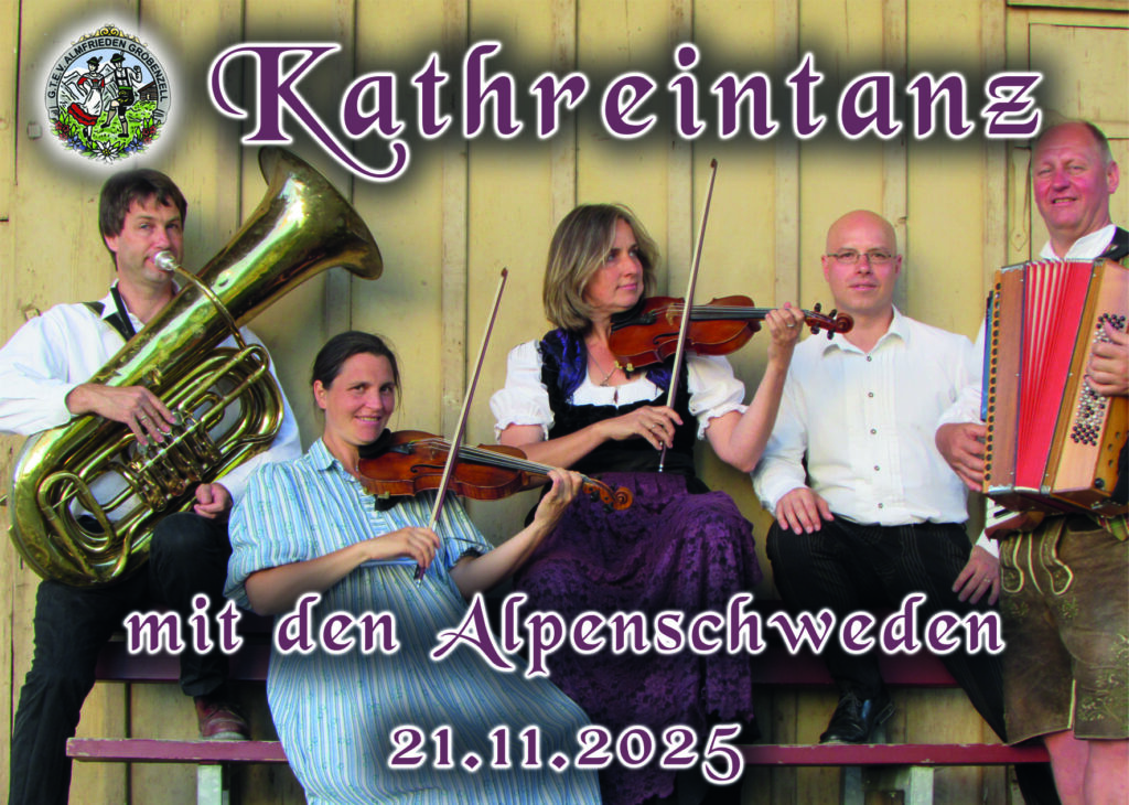Wie gewohnt erwartet die Gäste ein Abend voller Volkstanz und festlicher Stimmung. Die Alpenschweden sorgen für mitreißende Melodien. Tanzmeister Josef Zapf gibt Tanz-Anleitung und führt durchs Programm, damit werden auch die weniger geübten Teilnehmer sicher über das Parkett begleitet. Nach einem zünftigen Auftakt schwankt die Tanzfläche im Takt von Walzer, Polka und Dreher bis in die späten Stunden – und das ganz im Sinne des Kathreintanzes als traditionelles Jahresausklang-Fest.